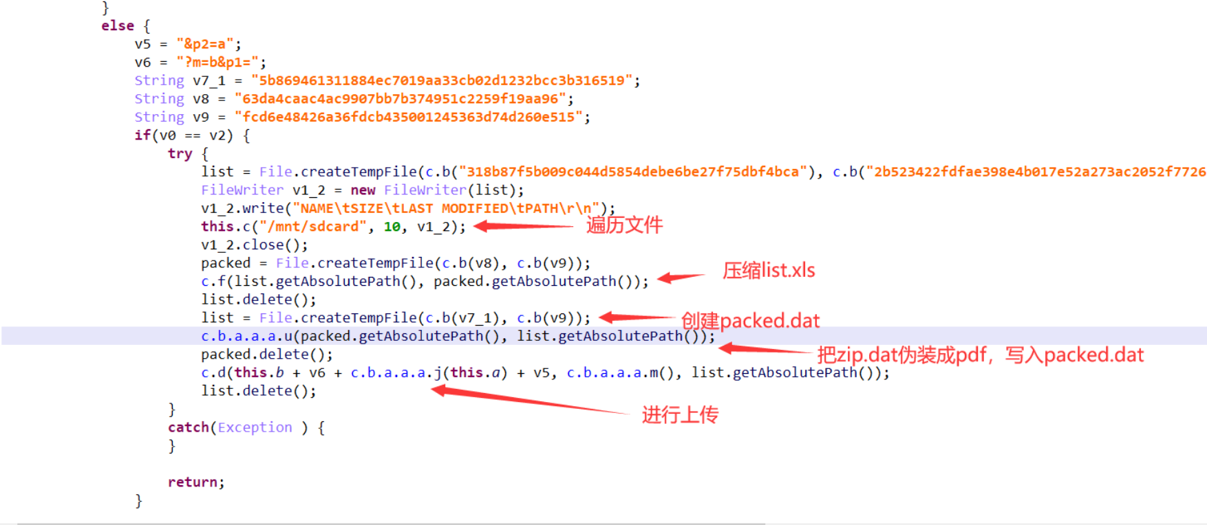 | 2 | 收集/sdcard目录下的文件的信息压缩后伪装并且上传 |