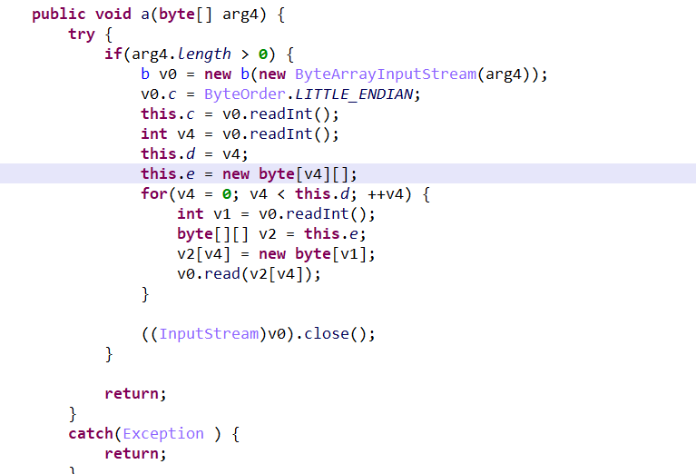 新建 a 对象并把刚才下载的数据传入 a 方法, a 方法中对 dat 的内容进行了解析