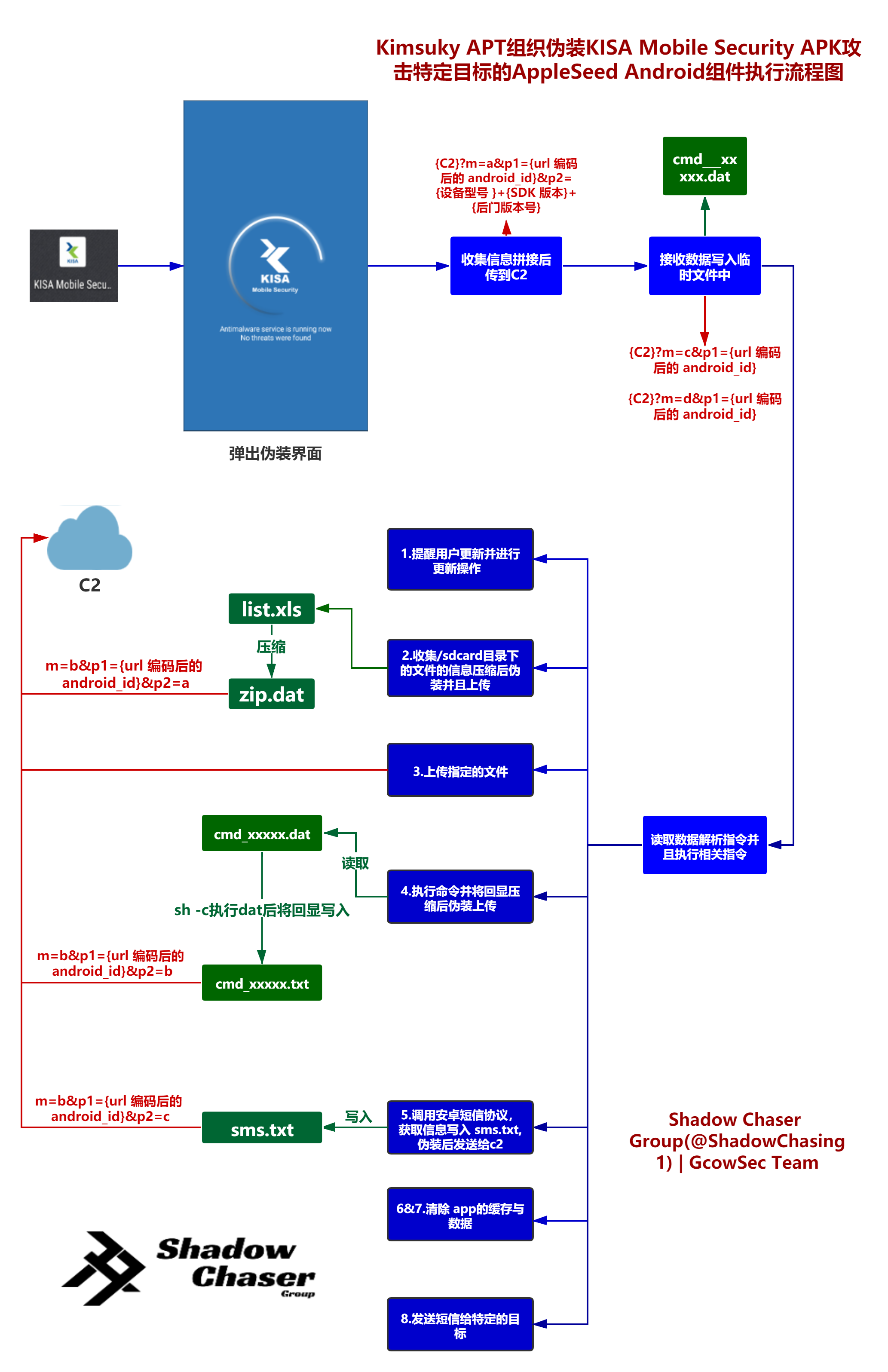 近日,Gcow安全团队追影小组在日常的文件监控中发现该组织正在积极的使用分阶段的恶意宏文档,恶意的wsf以及js文件释放并加载载荷同时释放并打开相关的诱饵文档以迷惑受害者以及部分模板注入技术的相关样本。同时我们也发现了其使用冒充KISA(Korea Internet & Security Agency)的官方安卓端安全检查软件针对特定目标进行钓鱼的活动,同时根据我们的分析发现其APK载荷与该组织之前一直在使用的AppleSeed(又名AutoUpdate)组件有很强的关联性,所以我们猜测该APK属于AppleSeed组件集下的Android攻击载荷。