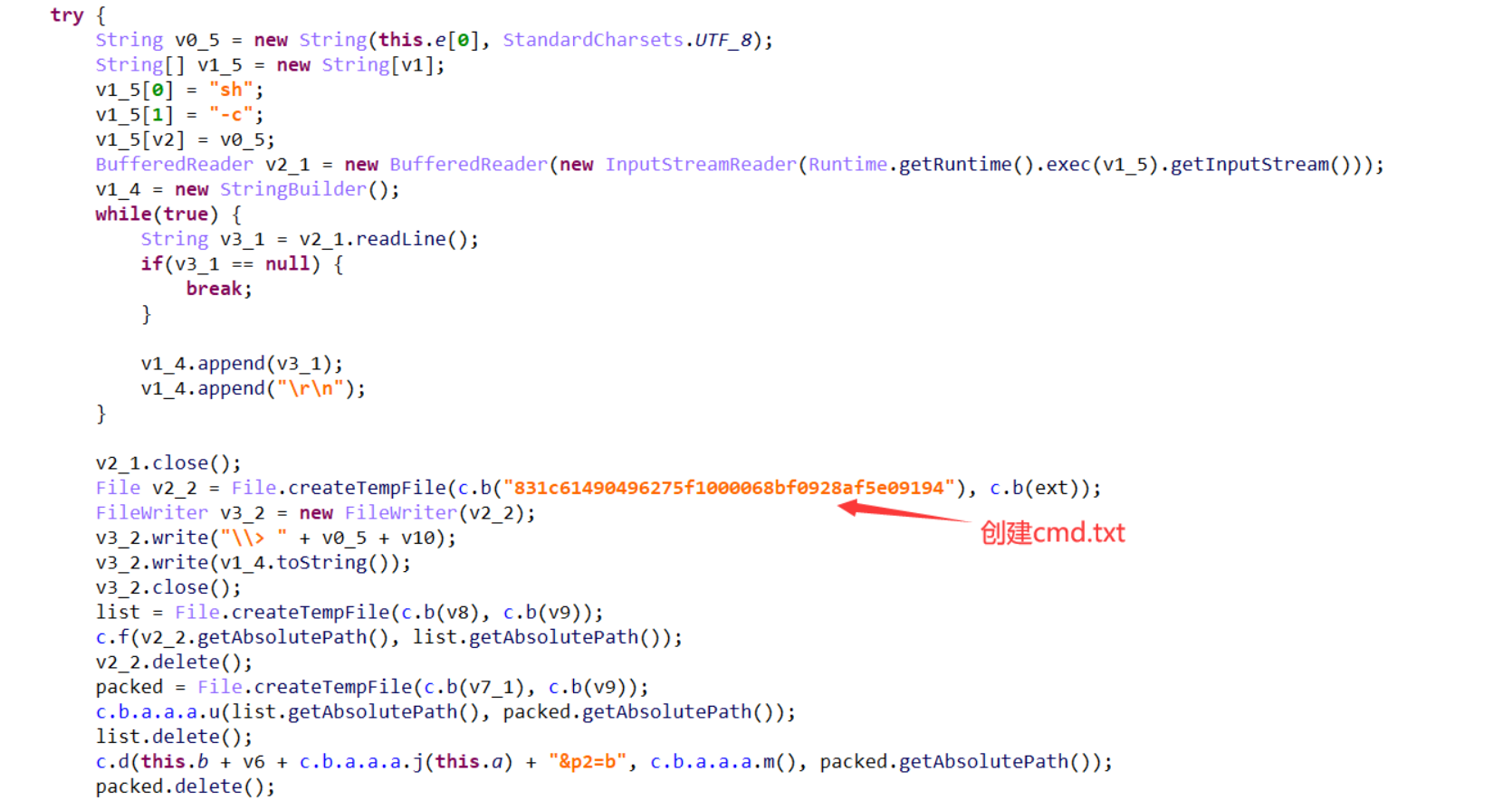 指令类型为 4 时,使用 “ sh -c “ 对 cmd_xxxxx.dat 的内容进行执行,把执行结果写入cmd_xxxxx.txt ,经过相同的伪装,调用 c.d() 上传