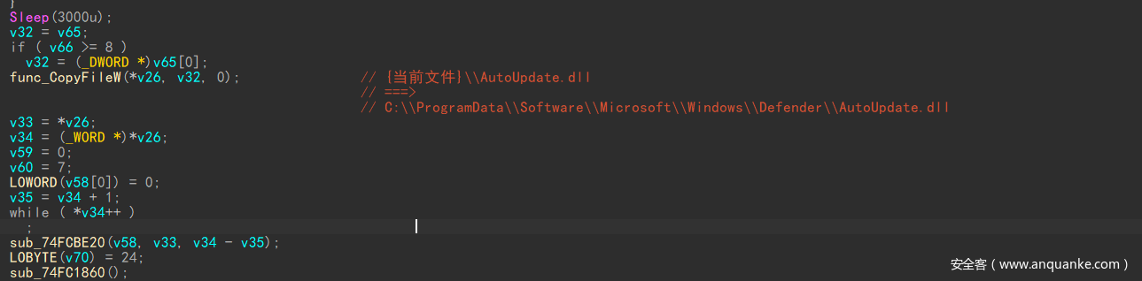 获取当前文件路径并且拷贝当前文件到C:\ProgramData\Software\Microsoft\Windows\Defender\AutoUpdate.dll