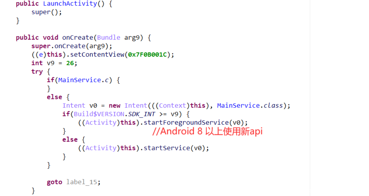 在 LaunchActivity 的 onCreate 方法中,启动了 MainService 服务。
