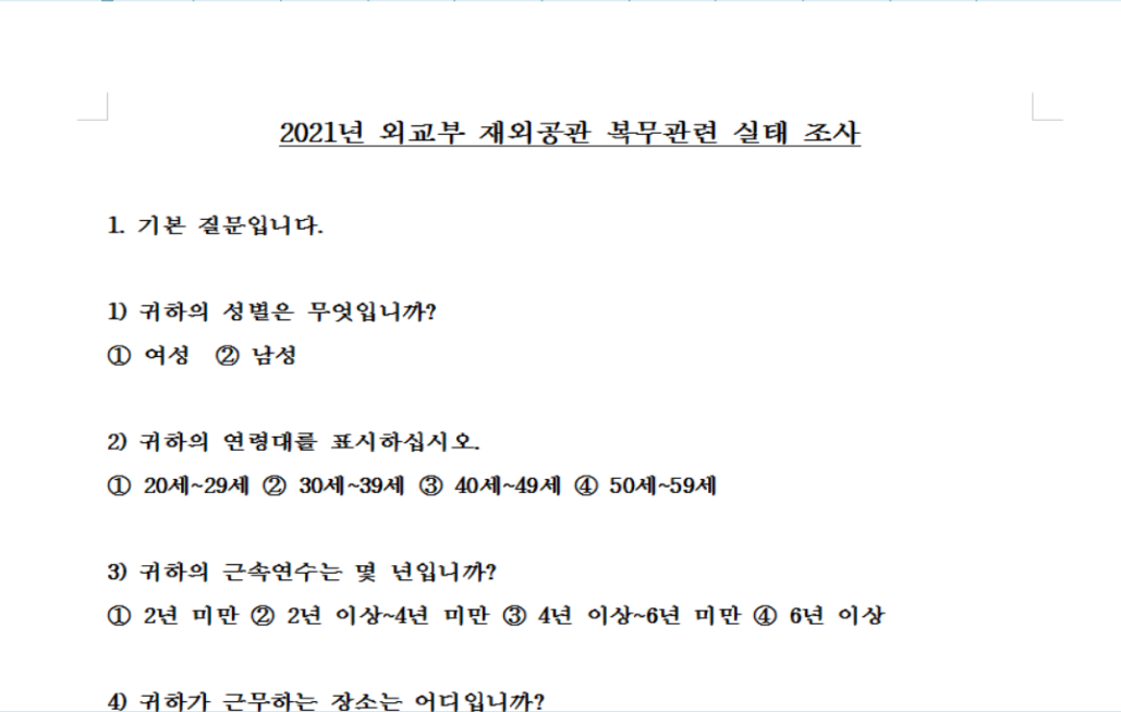3A4AB11B25961BECECE1C358029BA611(2021 외교부 재외공관 복무관련 실태 조사 설문지.hwp.js)
