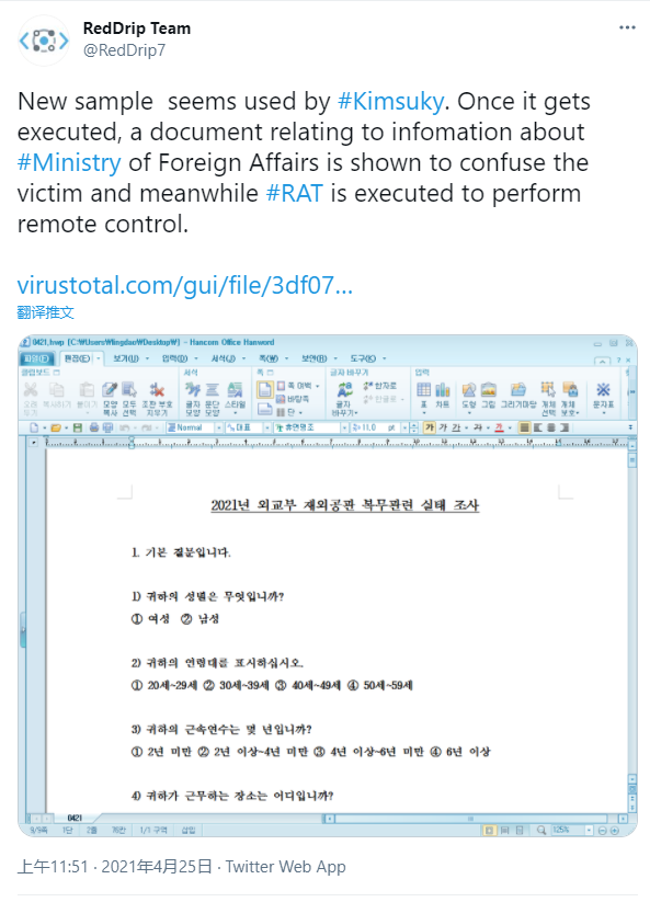kimsuky APT组织(又名Mystery Baby, Baby Coin, Smoke Screen, BabyShark, Cobra Venom) ,该组织一直针对于韩国的智囊团,政府组织,新闻组织,大学教授等等进行活动.并且该组织拥有windows平台的攻击能力,载荷便捷,阶段繁多。并且该组织十分活跃.其载荷有带有漏洞的hwp文件,携带恶意宏文档,释放dll载荷的PE文件,远程模板注入技术docx文档,恶意的wsf以及js的脚本文件等