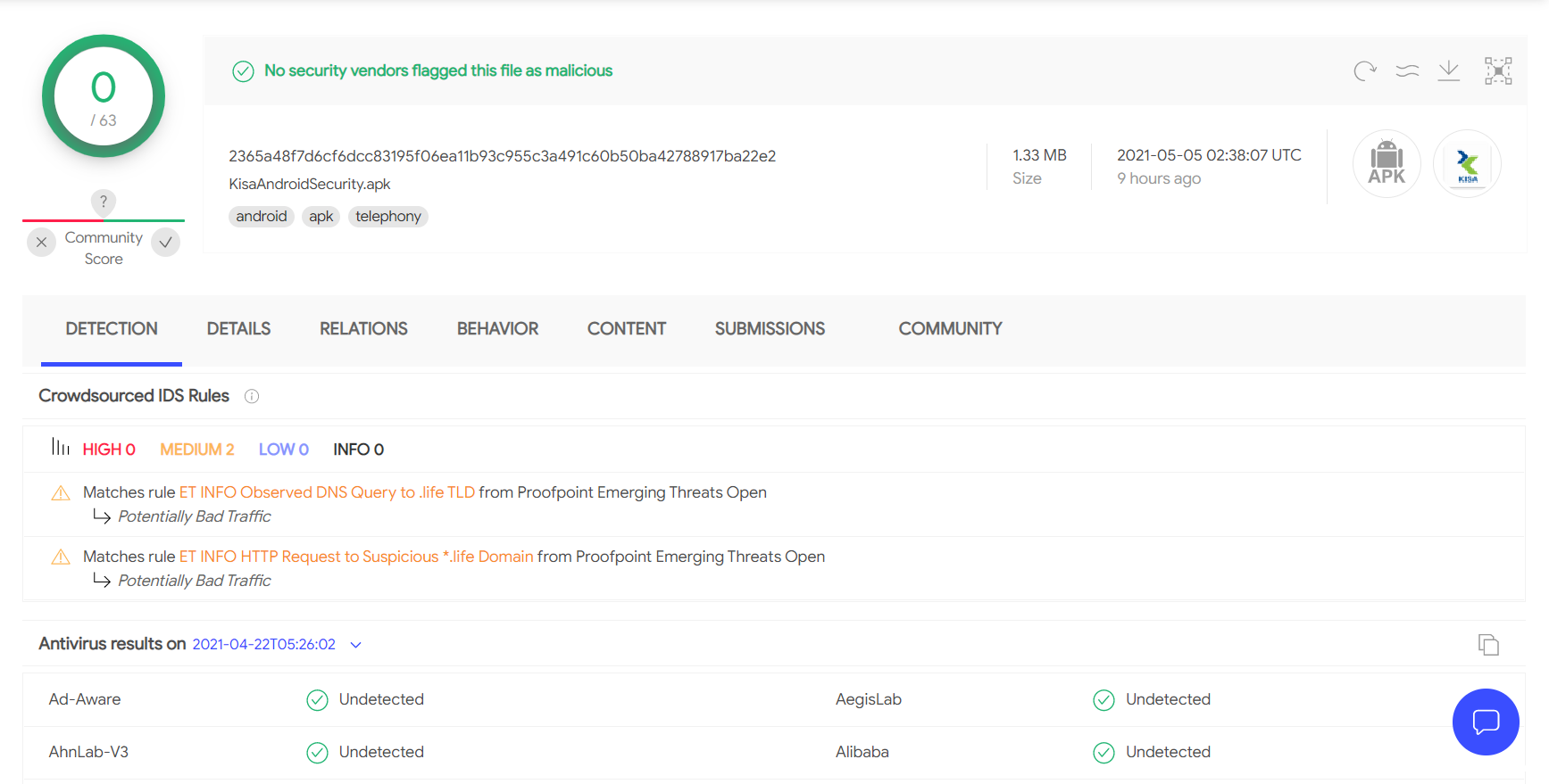 KimsukyAPT组织作为东北亚地区最为活跃的APT组织之一,其一直在更新自己的相关武器库以及更新其载荷的植入方式不断追求逃脱杀毒软件的检测。如下图,本文提到的APK木马当其刚上传到Virustotal平台的时候,其杀软检测的状况为:0/63。该组织也成为了东北亚地区地缘政治下的网络威胁的焦点,当然这值得我们去更多关注该组织的活动,Gcow安全团队追影小组将继续跟踪该组织更多的动向。