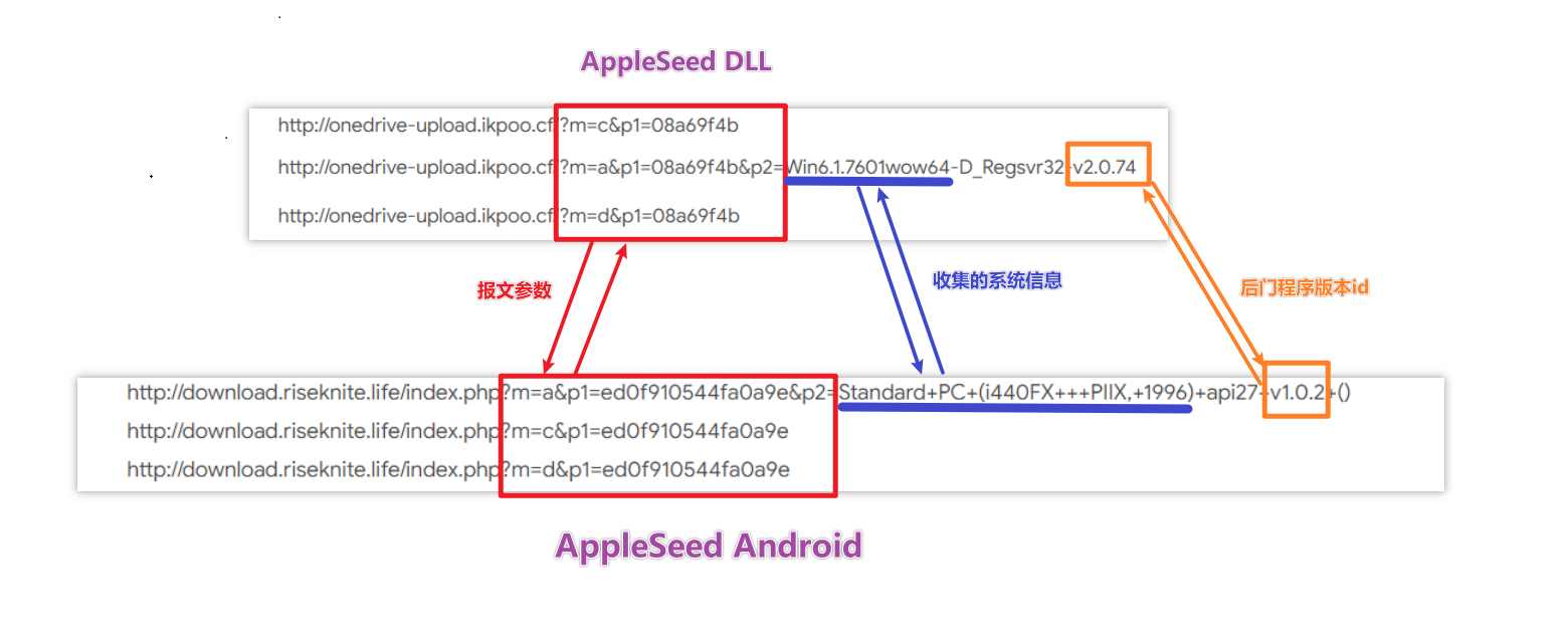 其二者在报文的参数上都以m=a&p1=,m=c&p1=,m=d&p1=进行相关的传参,同时其p2的第一个参数以及第三个参数分别都为所收集到的本机信息以及其后门的版本号.且p1都是根据本身的独特序列号以及id所构成的唯一认证因素,所以二者在流量报文的脚本上具有一定的相似性