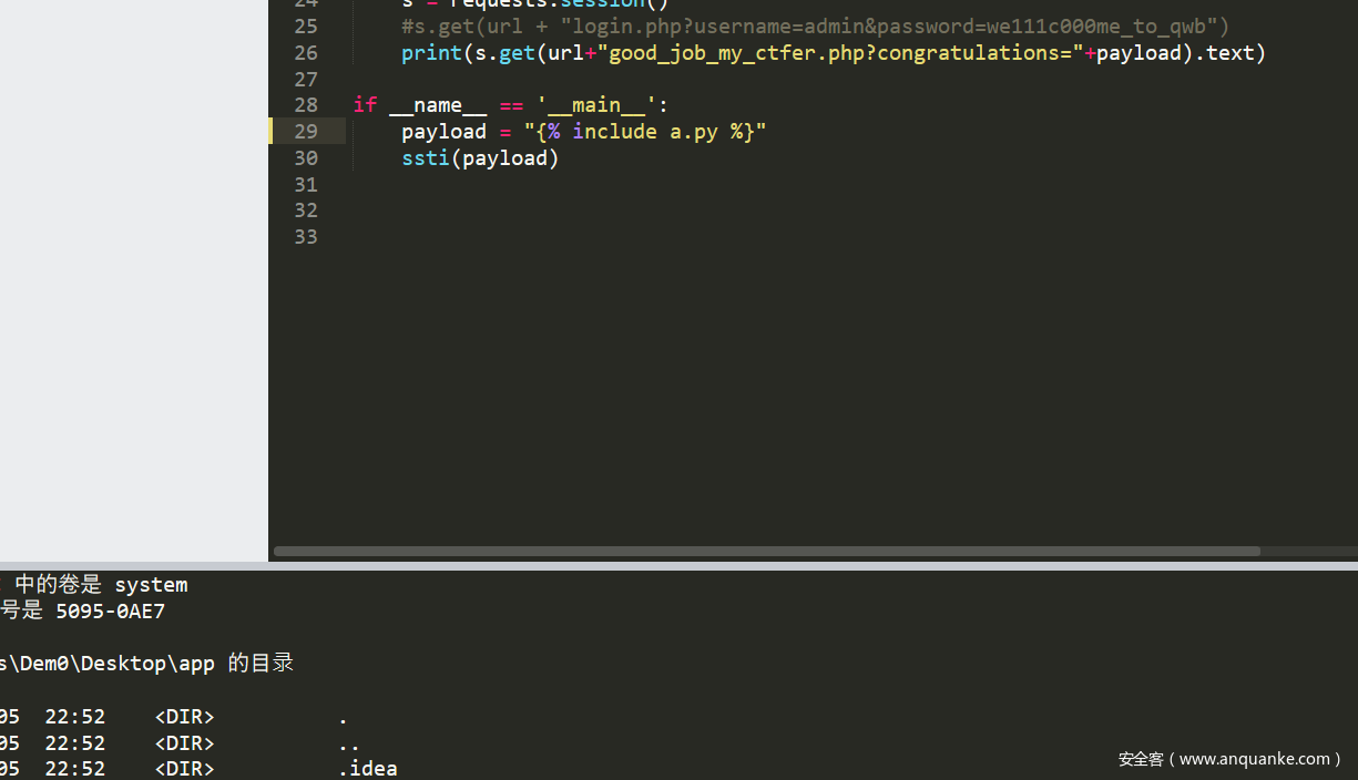 这里我只是单独地说一下,有关于include的,里面引入的代码会自动解析{{}}标签,我们不能将之抹去,那么利用的时候用上来payload来引入文件即可。