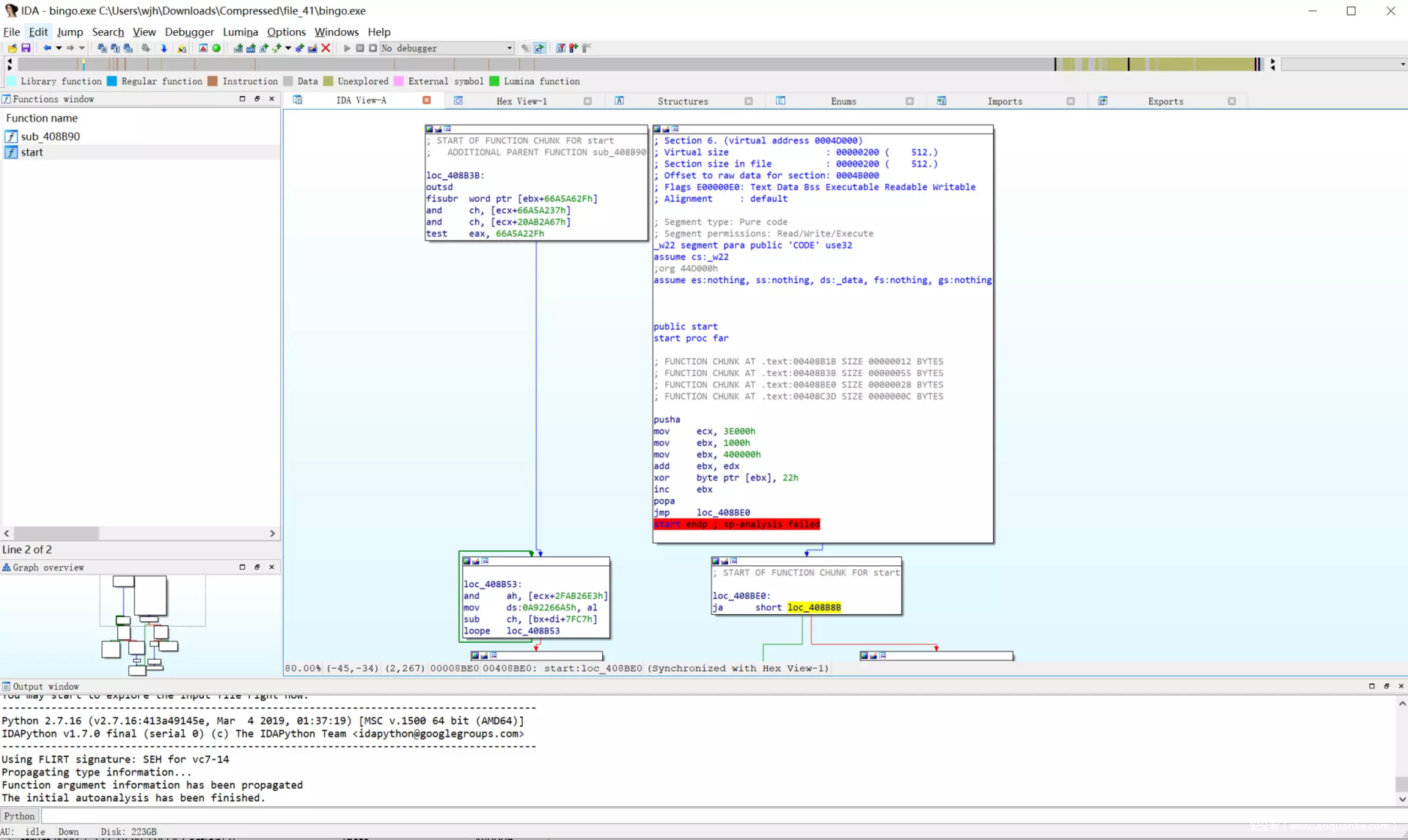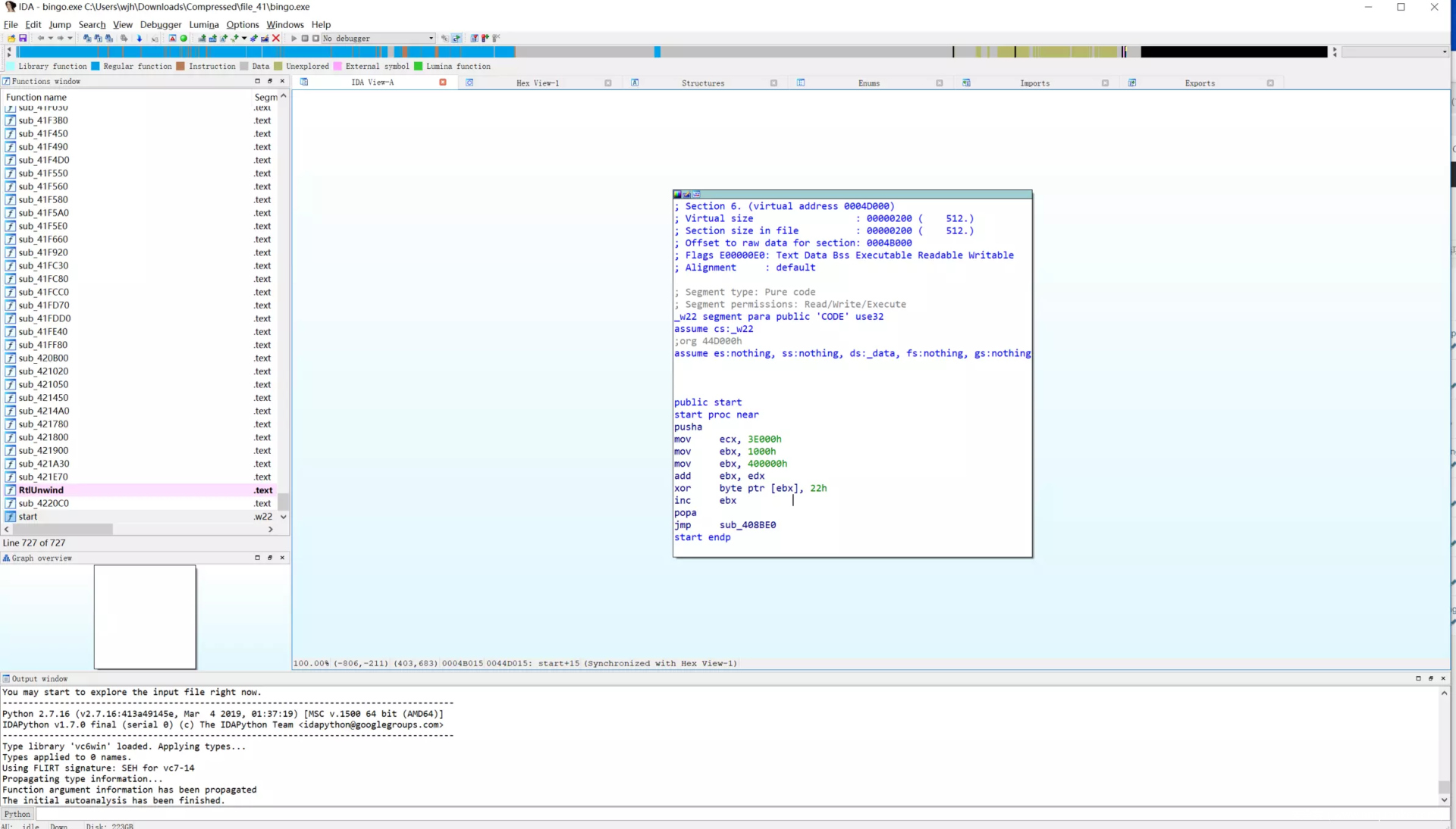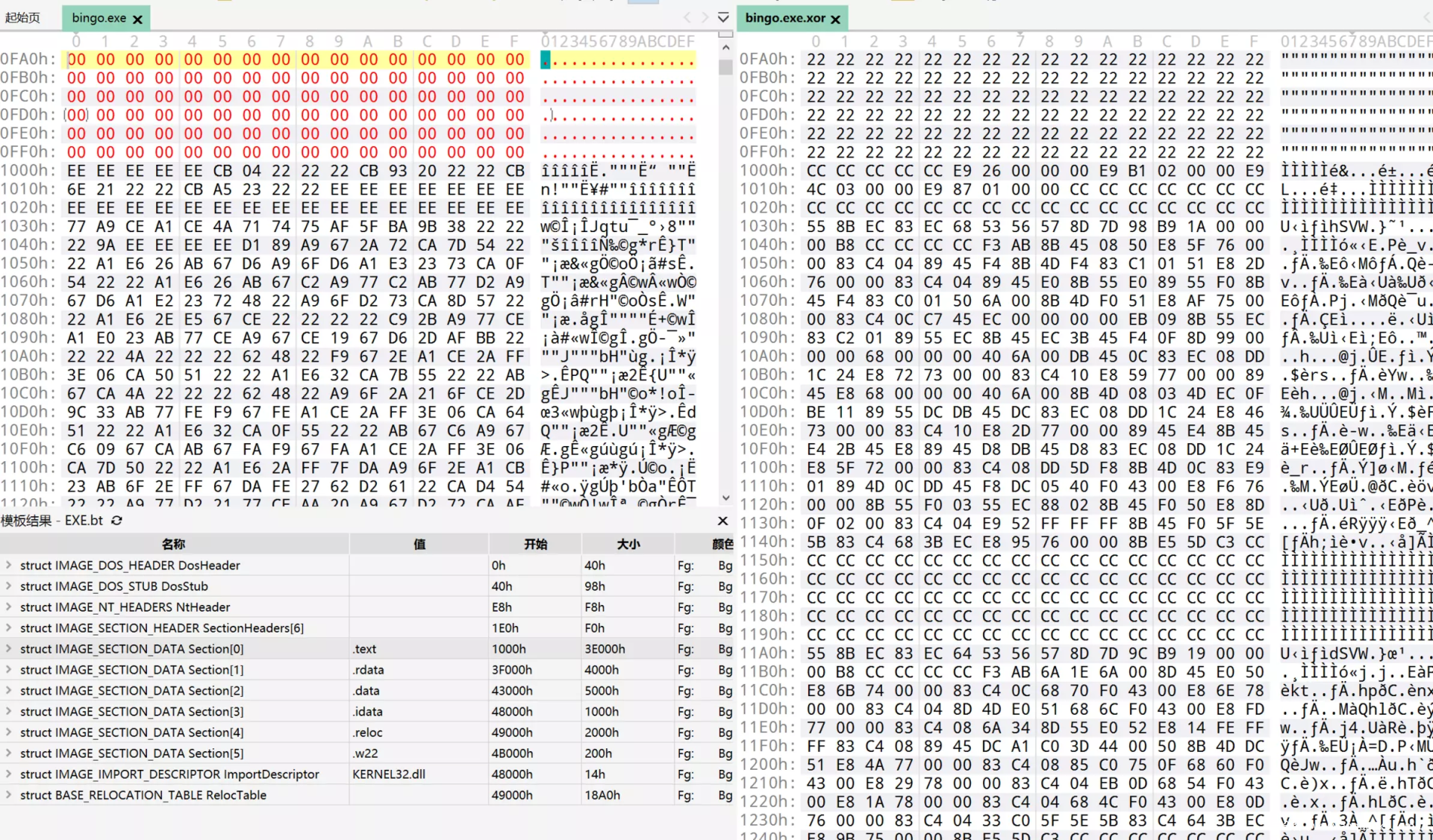 解密文件后,得到文件bingo.exe.xor,观察文件信息,发现实际上只有.text段进行了异或加密,其他内容都没有加密。