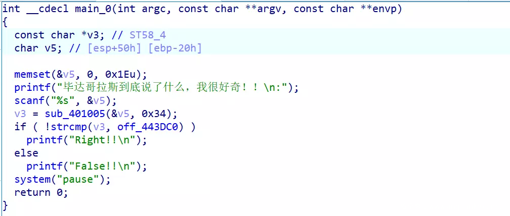 可以看出,程序对输入内容进行加密后与程序中 off_443DC0 (zaciWjV!Xm [_XSqeThmegndq) 进行比对。