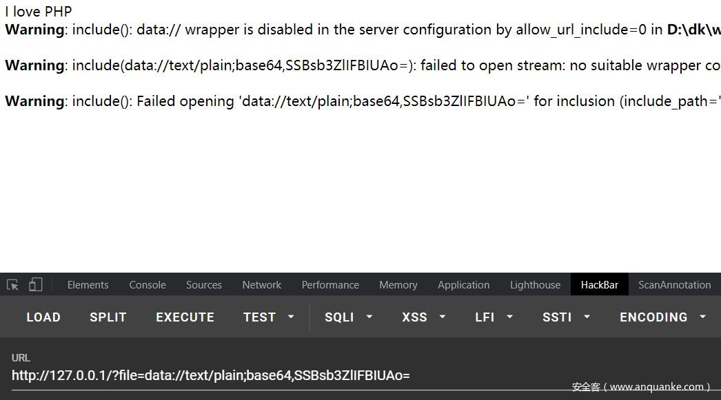 可以发现爆了3个错误,第一个是说配置文件里面禁用了data的数据流,第二是不能打开data的数据流,第三个是显示的不能打开文件,在include_path下面没有发现文件,所以就很明显在linux下面可以利用readfile不能读取文件,而include可以包含文件的特性了