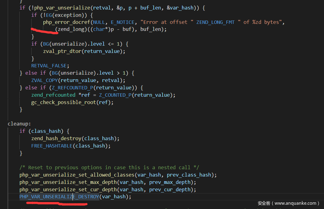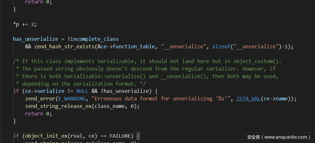 <a name=”然后看看php处理反序列化的细节吧,具体流程在php_var_unserialize里面,而且可以发现反序列化失败后直接抛的error,而不是异常,抛error就不会继续后面的代码了” class=”reference-link”>然后看看php处理反序列化的细节吧,具体流程在php_var_unserialize里面,而且可以发现反序列化失败后直接抛的error,而不是异常,抛error就不会继续后面的代码了