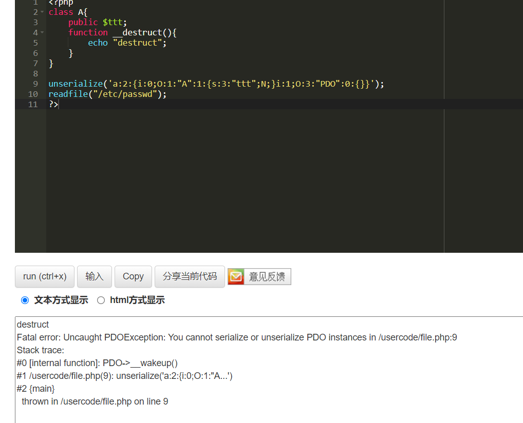 所以我们也就可以适当的利用unserialize的报错来即执行了__destruct,但是又不执行后面的代码
