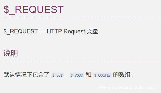 <a name=”好了,现在就明白了$_REQUEST的值是根据request_order的值来先后合并的,所以这里就会出现$_REQUEST里面的key先被$_GET赋值,再被$_POST赋值,这样就post的值就覆盖了get在request里面注册的值了,这个点印象中已经考过几次了” class=”reference-link”>好了,现在就明白了$_REQUEST的值是根据request_order的值来先后合并的,所以这里就会出现$_REQUEST里面的key先被$_GET赋值,再被$_POST赋值,这样就post的值就覆盖了get在request里面注册的值了,这个点印象中已经考过几次了
