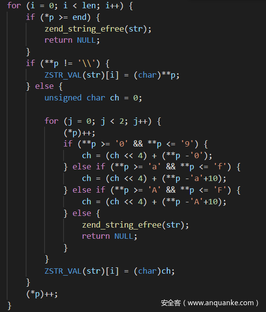 然后看看unserialize_str的主要处理逻辑,其实这里就是为了把\74变为t,其实大概的思想就是利用16进制和2进制的特性,因为16进制的第一个数字只影响对应二进制的前4位,第二个数字就只影响后4位