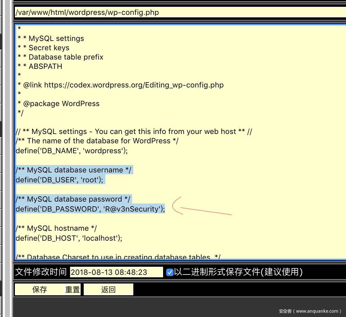 下一步就是提权了,在/wordpress/wp_config.php 里拿到mysql的账户密码,如图: