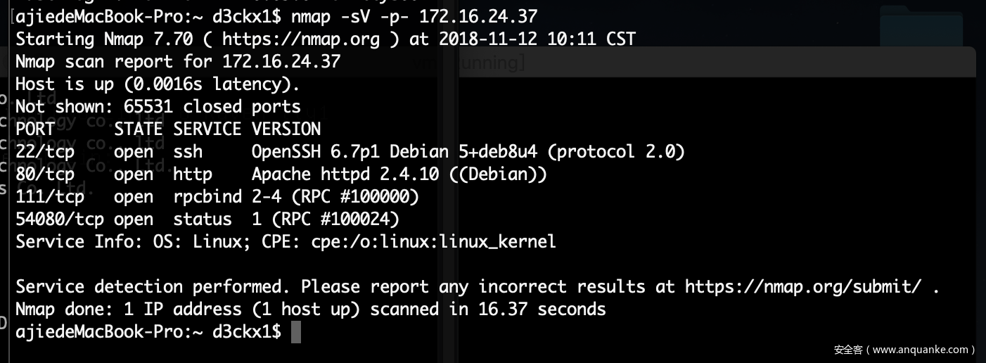 已经知道了ip,下一步就是使用nmap探测靶机开放的端口了,如图: