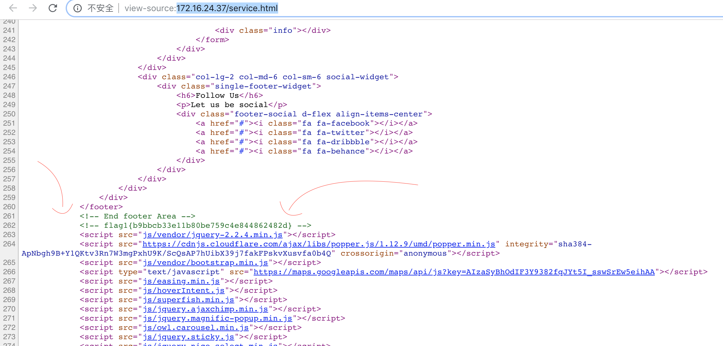 我们在 http://172.16.24.37/service.html 拿到了第一个flag,在源代码262行处,如图: