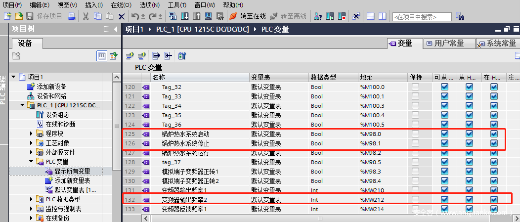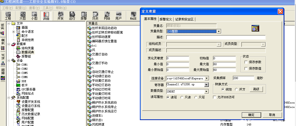 1)单击软件界面“Click to add a static tag”,或者工具栏“New Tag”增加一个标签。设置Tag属性,定义名称,和地址。这里的地址要与PLC中定义的变量地址对应,例如,在博智工控安全实验箱中的S71200PLC中定义了一个如下的变量,在本通讯实例中我们只应用红框中的3个变量。
