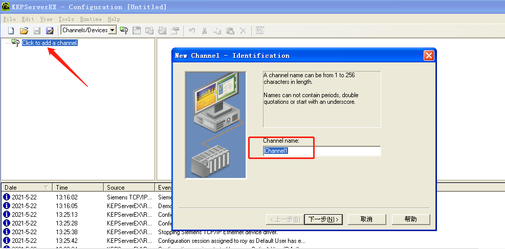 1)在OPC服务器中打开“KEPServerEX 5 Configuration”软件,新建一个工程,再单击软件界面“Click to add a channel.”或者工具栏上的“New Channel”,新建一个通道,修改通道名“Channel name”或不作修改: