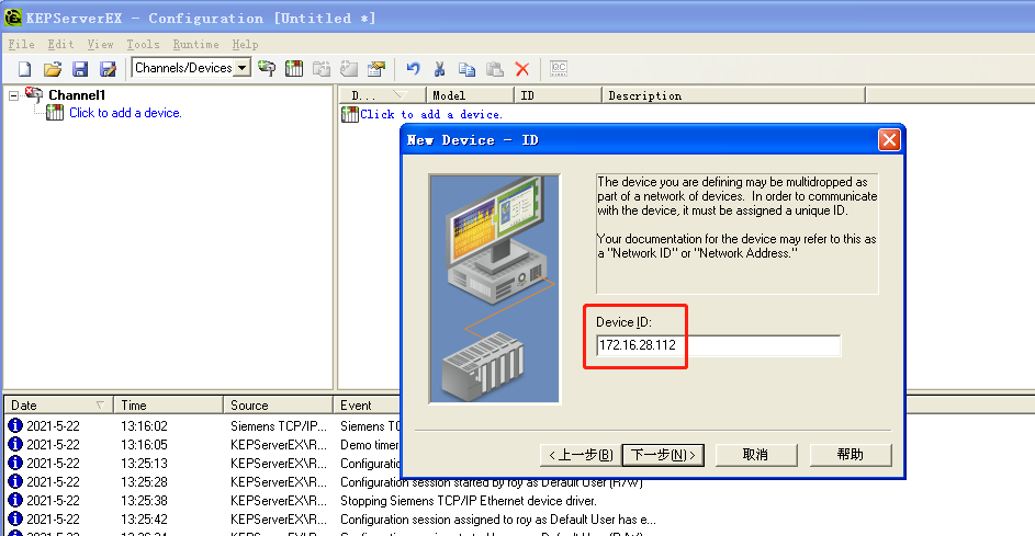 3)选择设备ID“Device ID”, 这里指的是所要连接的PLC设备的IP地址。假如IP地址为:172.16.28.112,则设置如下: