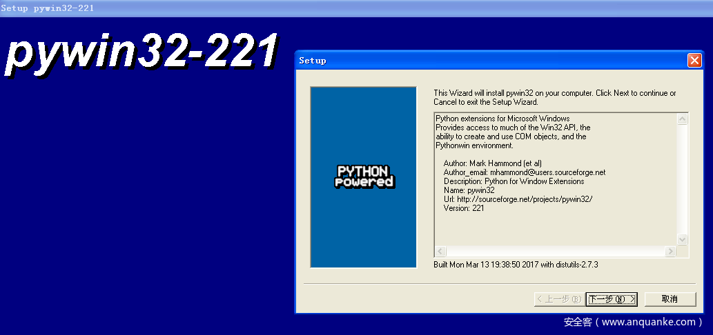 2)再运行pywin32-221.win32-py2.7.exe文件,点击“下一步”如下图: