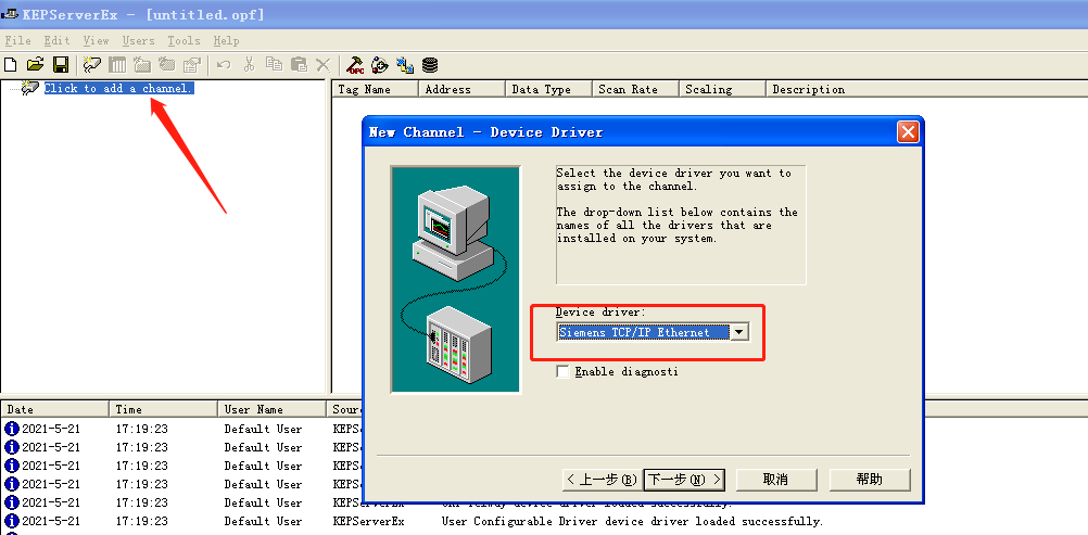 2)选择你想分配给本通道的设备驱动“Device driver”,这里选择“Siemens TCP/IP Ethernet”,另外的omron PLC可以选择“Omron FINS Ethernet”: