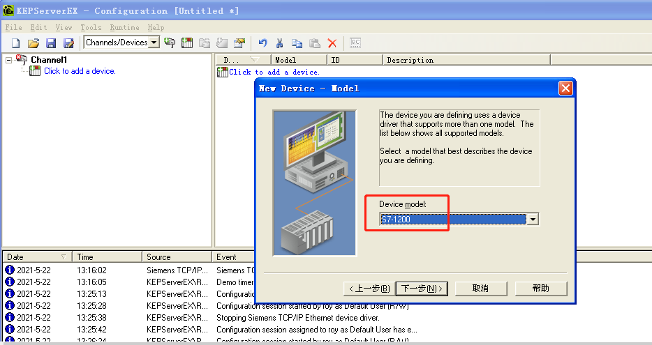 2)选择设备模型“Device model”, 这里我们选择“S7-1200”,如果是omron PLC则选择“CS1”。