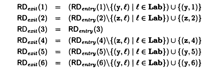 接下来,为了让分析器能够获取信息,我们将流程图转化成一系列方程,来将代码逻辑关系用数学的方式表示出来。依旧延续着上一篇文章的定义原则。将一句代码划分为入口状态RD entry和出口状态RD exit 同时用形如 (v,l) 的表达式来定义关于v变量的改变。我们以第一句为例子做一个演示。原代码为 y = x 的一个赋值语句。RD exit(1) 就可以等价于 RD entry(1)中 y 的赋值语句 (y,l) 并上 此时y的赋值语句(y,1)。此时的 l 为在这一段代码开始之前的对于代码进行定义后的那个赋值语句的标签。而这个标签存储在 Lab 中。Lab是存储 l 的一个表格。完整的表示如图所示。